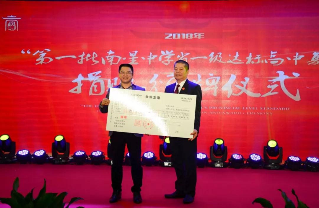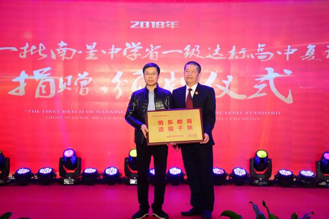 为支持南星中学“福建省一级达标高中”的复评工作,也为协助提高南星中学的办学品位和提高综合办学效益,进一步满足广大群众对于优质教育的需求,水头镇商会向南星中学捐赠30万元的复评资金。由黄明经会长向南星中学校长尤春生捐赠支票,水头镇镇长蔡清安为商会颁发“情系教育 造福千秋”牌匾。此外,南安市工商联副主席李景志为积极向南星中学捐赠共计110.5万元的19位个人及3对贤伉俪颁发捐赠证书。