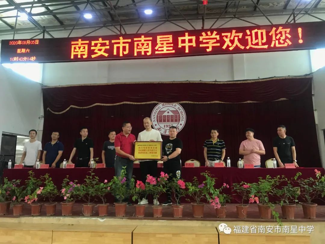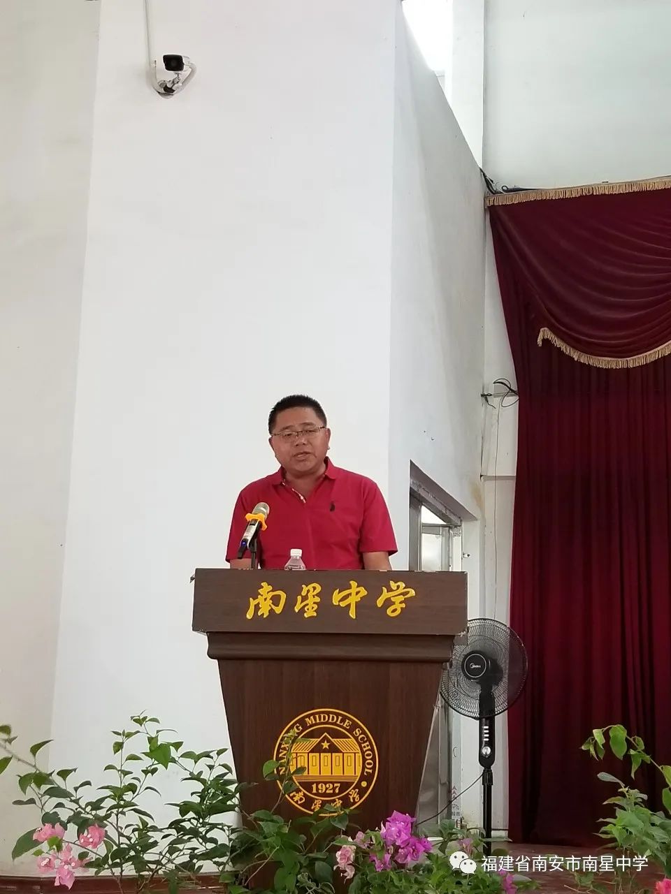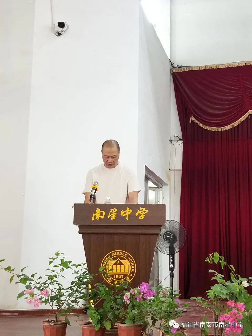 年段长沈金足老师宣布辉盛石业有限公司董事会代表吴国庆总经理慷慨解囊,捐资人民币贰万元设立奖教教学基金,表彰南星中学高二年级在过去一年中取得优异成绩的教师和学生,以此支持助力南星中学2022届年高二年段工作。