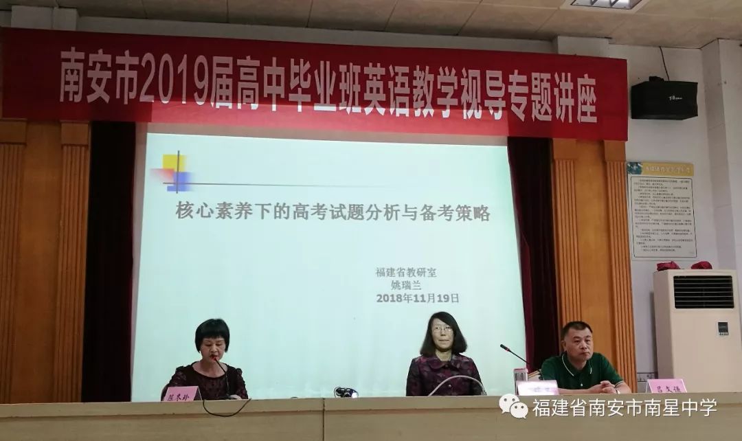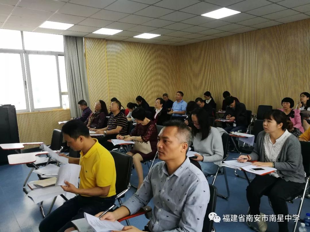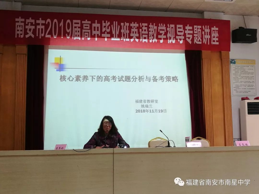 11月18日下午-11 月19日,为期一天半的南安市2019届高中毕业班英语教学视导活动在南星中学举行。参加视导活动的有福建省教研室姚瑞兰老师、南安市教师进修学校兼职教研员、特级教师吕文谦老师、南安市教师进修学校陈冬玲教研员、南星中学校领导班子、教研室和教务处成员以及全市高中毕业班英语学科全体老师和非毕业班的备课组长。活动由南安市教师进修学校陈冬玲教研员主持。