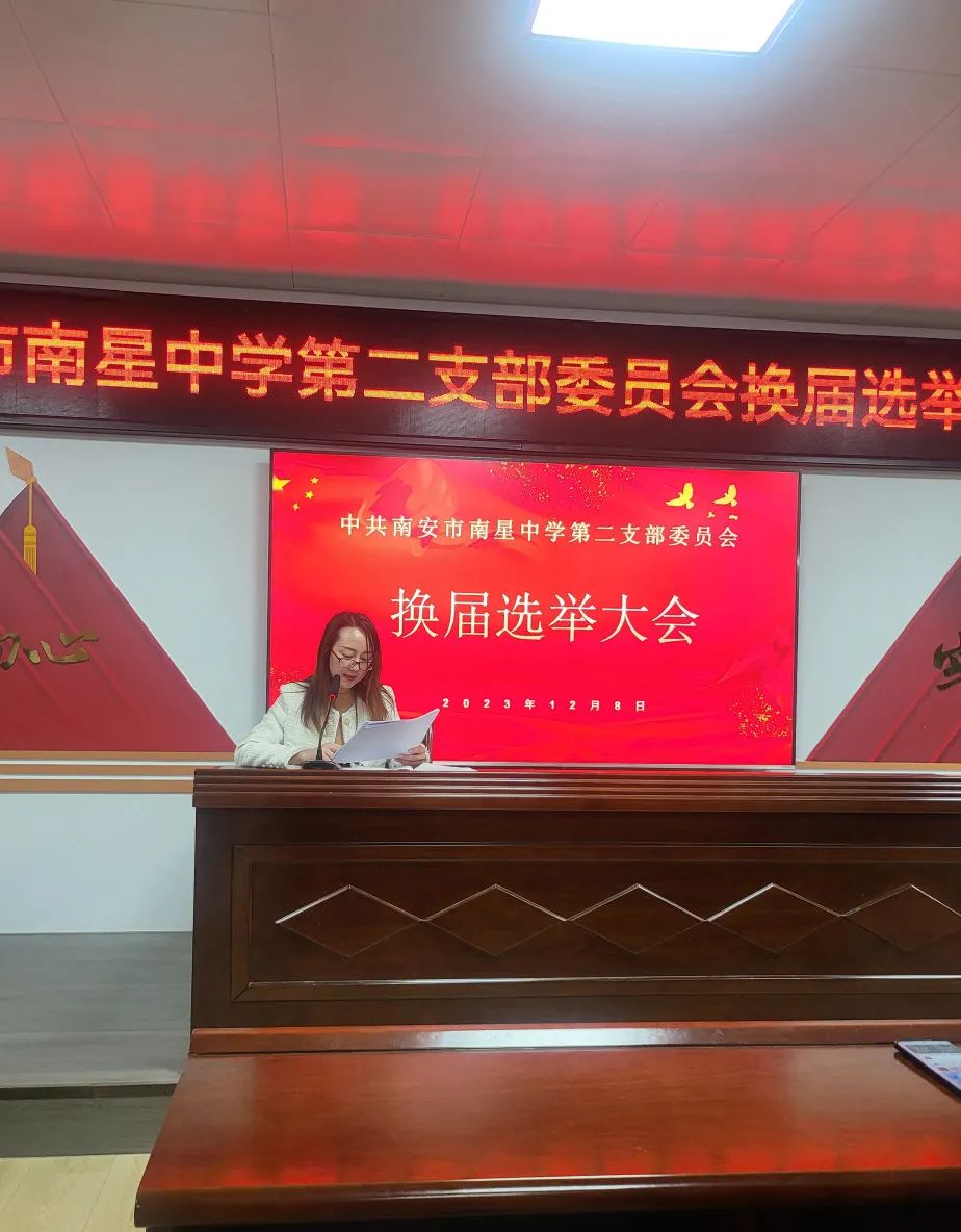 为进一步加强基层党组织建设,增强党组织创造力、凝聚力和战斗力,根据《中国共产党章程》《中国共产党支部工作条例(试行)》《中国共产党基层组织选举工作条例》的有关规定和中共南安市教育系统委员会的批复精神,2023年12月8日,中共南安市南星中学总支部委员会召开党员大会,进行党总支换届选举,会议选举产生了新一届党总支部委员会委员。 大会由上一届总支组织委员周龙拿主持 会议听取和审议了上一届党总支部委员会工作报告。 选举过程 大会严格按照《中国共产党章程》《中国共产党基层组织选举工作条例》等相关规定,采用无记名投票方式和差额选举的办法,选举黄新生、徐文彬、郑振隆、周龙拿、江鸿霖等5位同志当选为新一届党总支部委员会委员。 随后,新一届党总支部委员会召开了第一次全体会议,以无记名投票方式选举黄新生同志为党总支书记、郑振隆同志为党总支副书记,并明确了委员分工。 各支部换届选举大会 会后,各支部分别召开了新一届党支部换届选举大会,差额选举了各支部委员会委员。 本次换届选举大会工作组织严密、程序规范、进展顺利。新一届党总支部委员会的产生为我校党建工作注入新的能量,赋能我校各项工作有序推进。相信在新一届党总支的领导下,南星中学的全体党员及教职工将凝心聚力,开拓进取,为推进学校跨越式发展贡献自己的力量。 ★ 策划:党建办 编辑、初审:李诗婷 复审:林夏蓉 终审:郑振隆