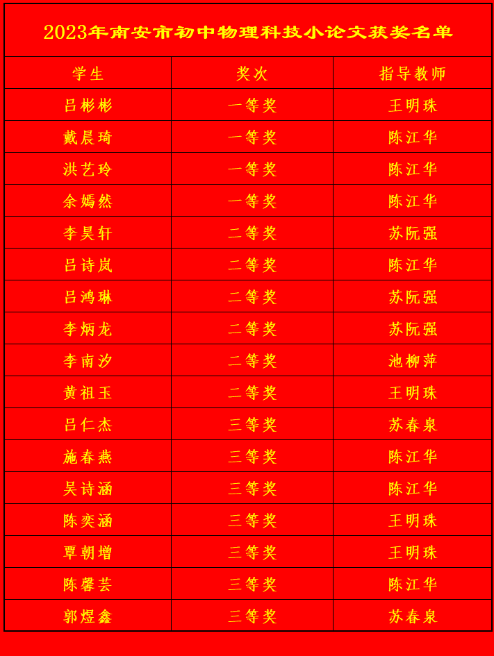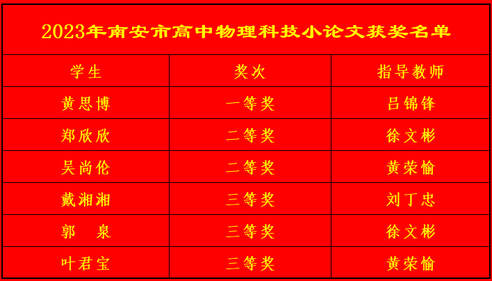 近期,我校学生在2023年南安市高中、初中物理科技小论文比赛中获得优异成绩,充分展示了南星学子良好的核心素养和勇于探索的精神风貌。 策划:南星中学宣传组 编辑、初审:李诗婷 复审:林夏蓉 终审:洪侨柳