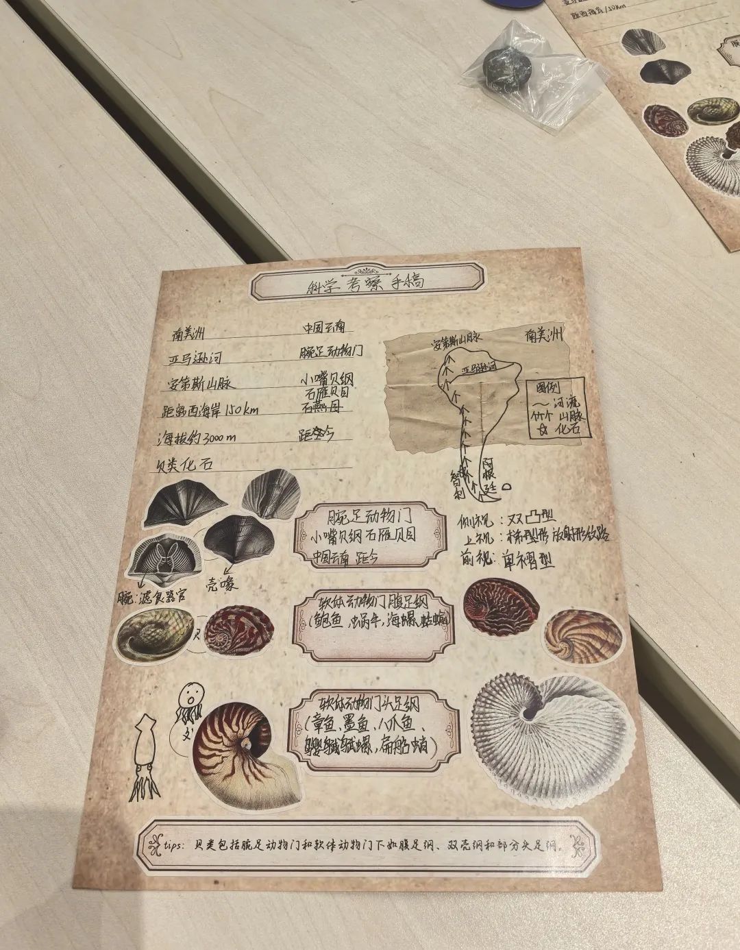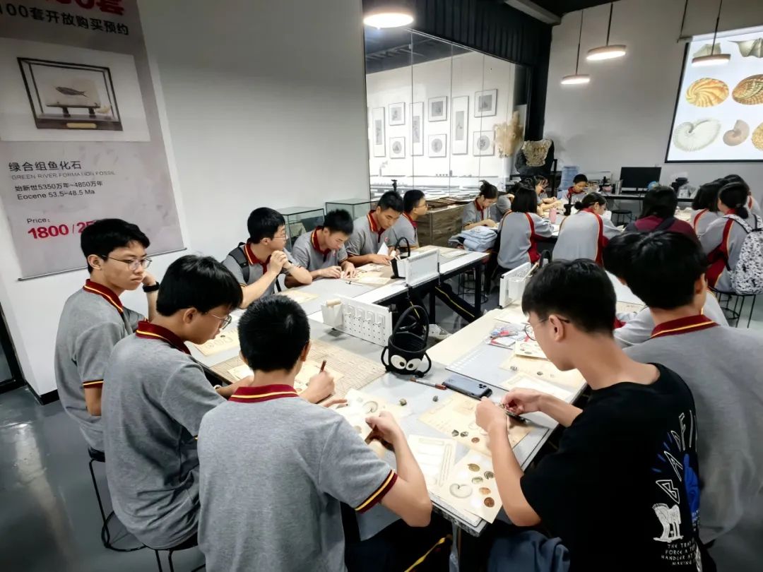 最后,研学老师组织了一场妙趣横生的科普小课堂,带领学生探究物种起源。通过观察化石,感知其形态,同学们绘制科学考察手稿,发掘自己“小科学家”的潜质,感悟到大自然的神奇奥秘。