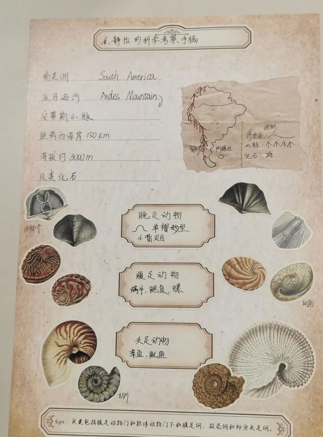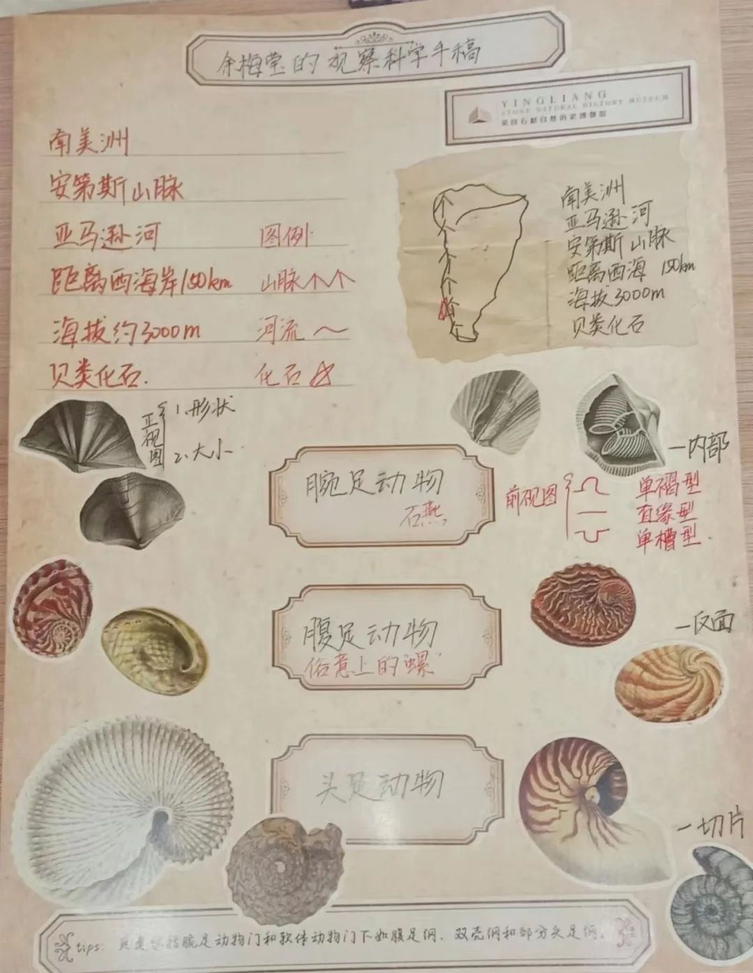 今日的研学之旅我们走进了英良博物馆,这里的每一件展品都诉说着千年的变迁,蕴藏着历史的智慧。我们跨越时空,聆听着来自古老生物的生命力。在这场短暂的旅行中。我们开展了一堂别开生面的互动课堂。在工作人员的带领下,我们跟着达尔文的脚步完成一份独属于自己的科学手稿考察手稿。导游小姐手持讲解器,为我们详细介绍了博物馆的历史以及馆内的珍贵化石。我被一块块看似普通的化石所吸引,它们在岁月的洗礼下,化作了漫长时空的见证。研学之旅接近尾声时,我们还收到了来自博物馆赠送的小纪念品。对于我们来说,这不仅仅是一次学习的经历,更是一场心灵之间的触动。