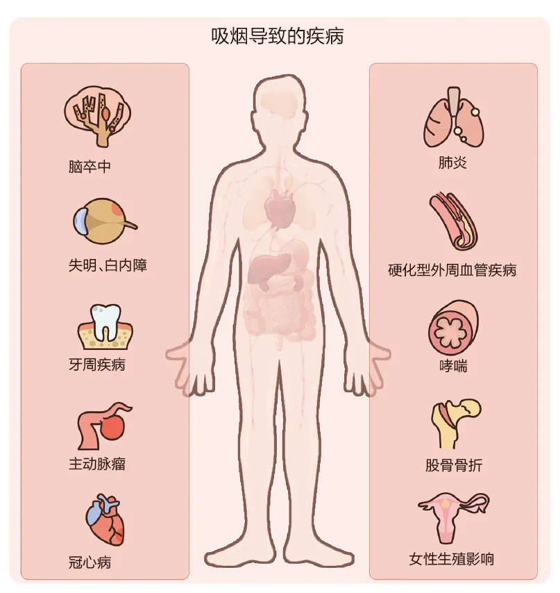 吸烟可带来减少寿命、诱发心血管疾病、导致肺部疾病、影响睡眠等多种危害,同时,它也是多种疾病的诱发因素。烟草中的有害成分达3000余种,明确的致癌物有69种。你可能不知道:
