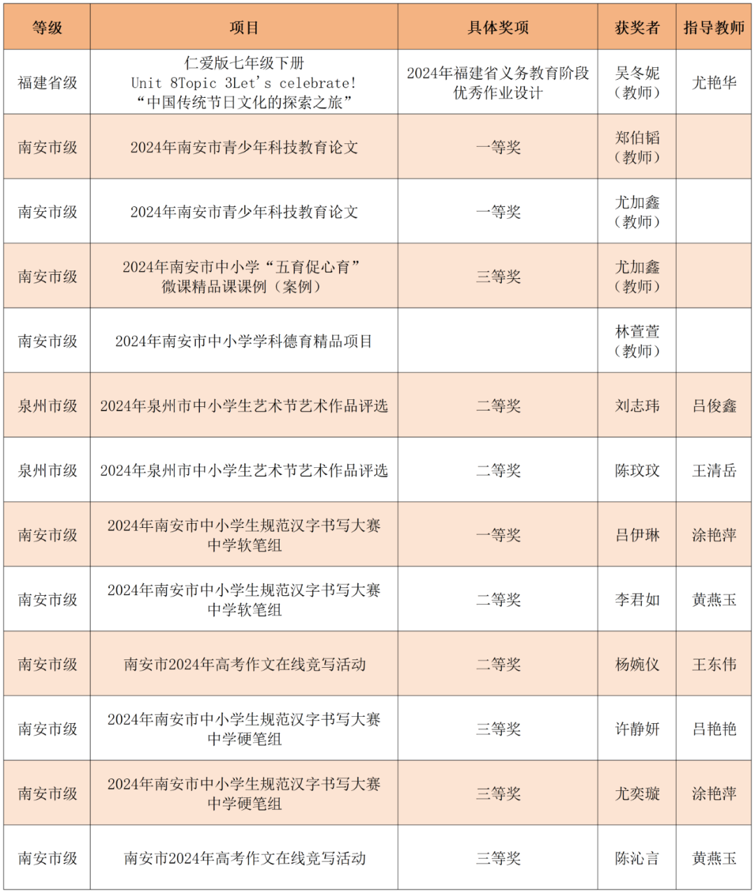 近日,福建省教育厅公布2024年福建省义务教育阶段优秀作业设计名单,我校吴冬妮老师作品闯进省级优秀名单。 2024年南安市青少年科技教育论文比赛,我校郑伯韬老师与尤加鑫老师均取得一等奖的好成绩。林萱萱老师作品选获2024年南安市中小学学科德育精品项目;尤加鑫老师再一次在2024年南安市中小学“五育促心育”微课精品课课例(案例)获得三等奖。 同时,刘志玮与陈玟玟同学在2024年泉州市中小学生艺术节艺术作品评选中均荣获二等奖;杨婉仪与陈沁言同学南安市2024年高考作文在线竞写活动中分别获得南安市二等奖与三等奖。 由南安市教育局、南安市语委办主办的2024年南安市中小学生规范汉字书写大赛刚刚落下帷幕,我校吕伊琳、李君如、许静妍和尤奕璇4位同学分别获得中学组软笔书法一等奖、软笔书法二等奖和硬笔书法三等奖的好成绩。 为以上优秀的南星人点赞! 策划:校宣组 编辑、初审:李诗婷 复审:林夏蓉 终审:郑振隆