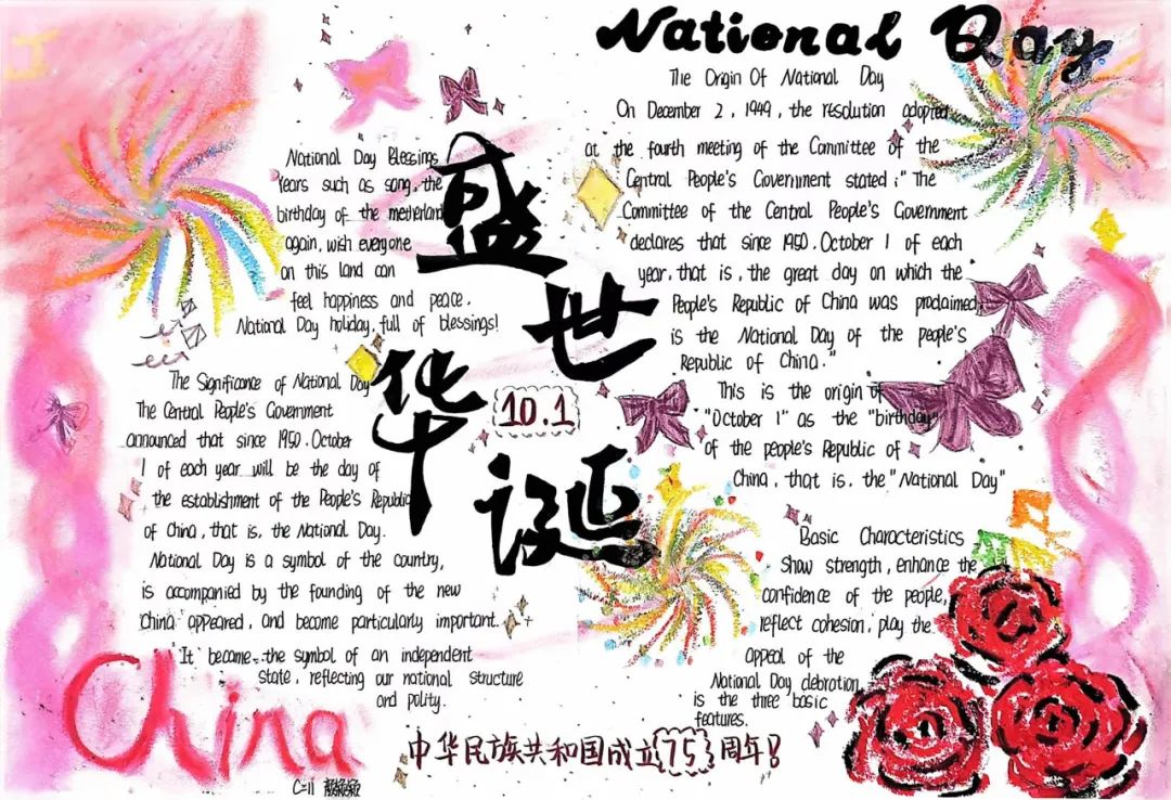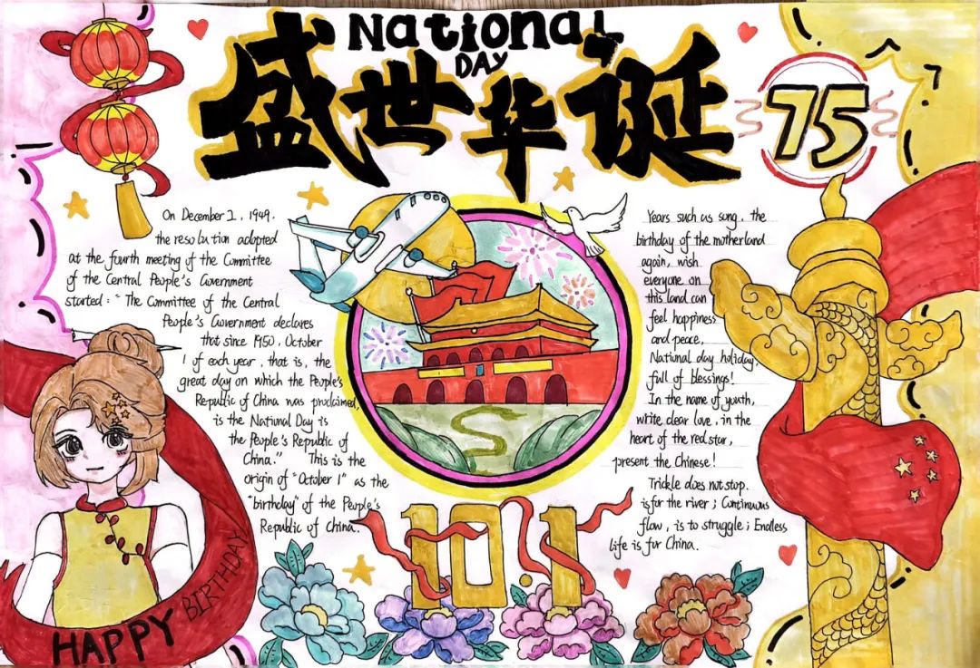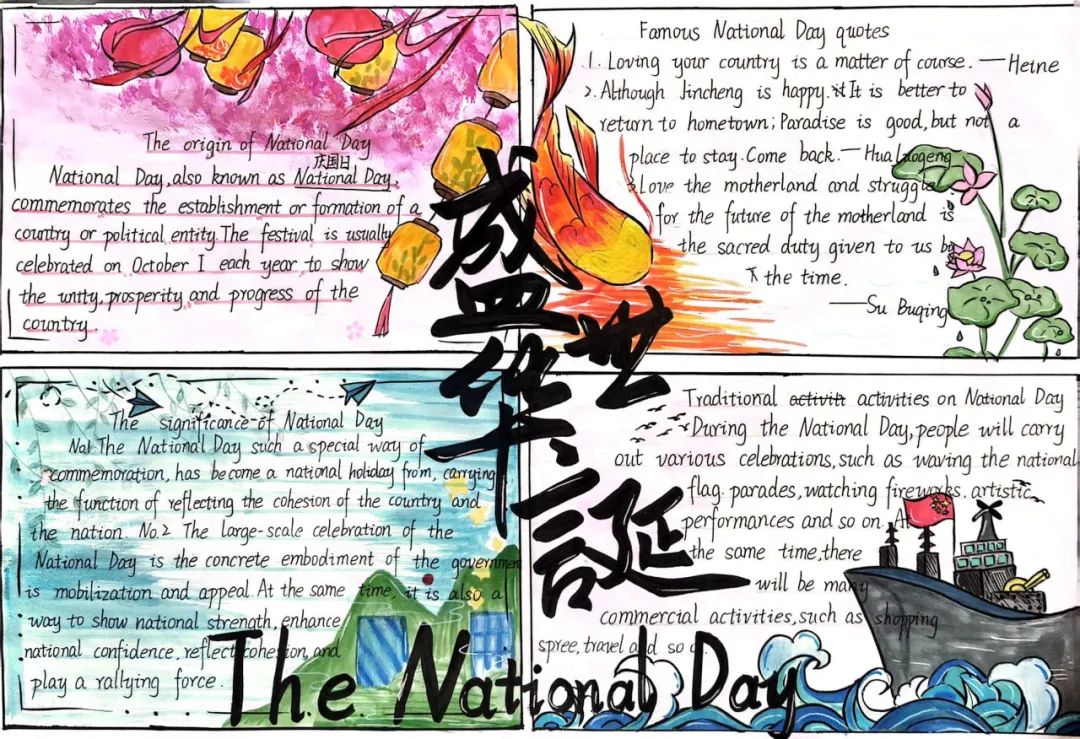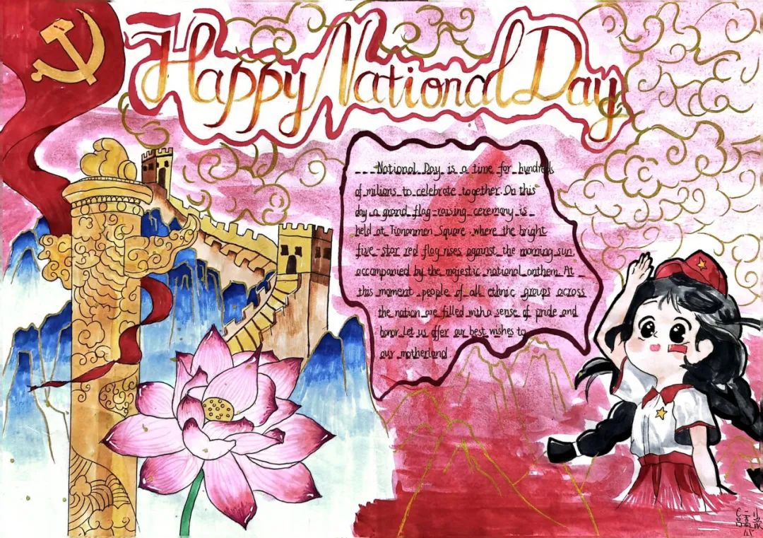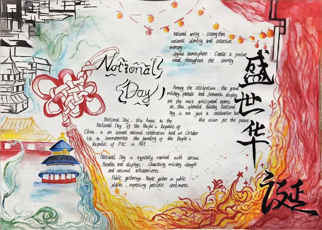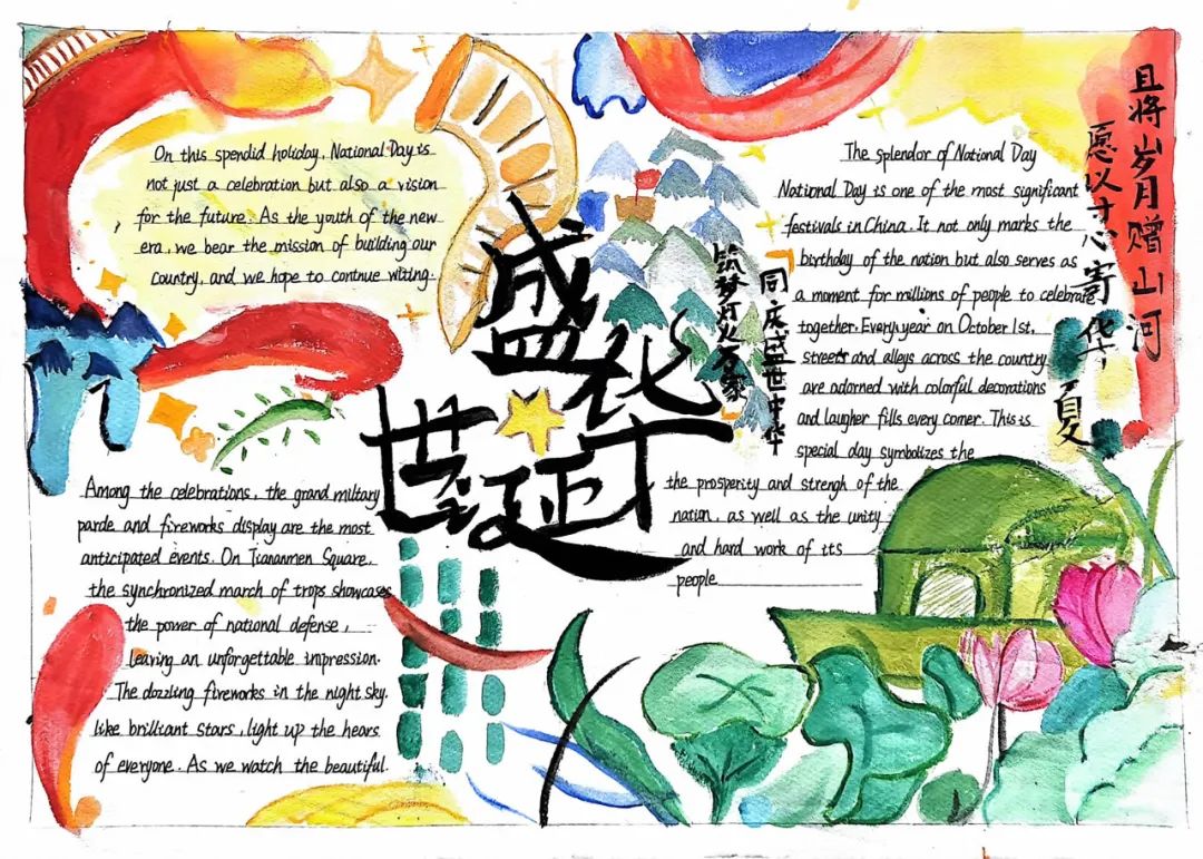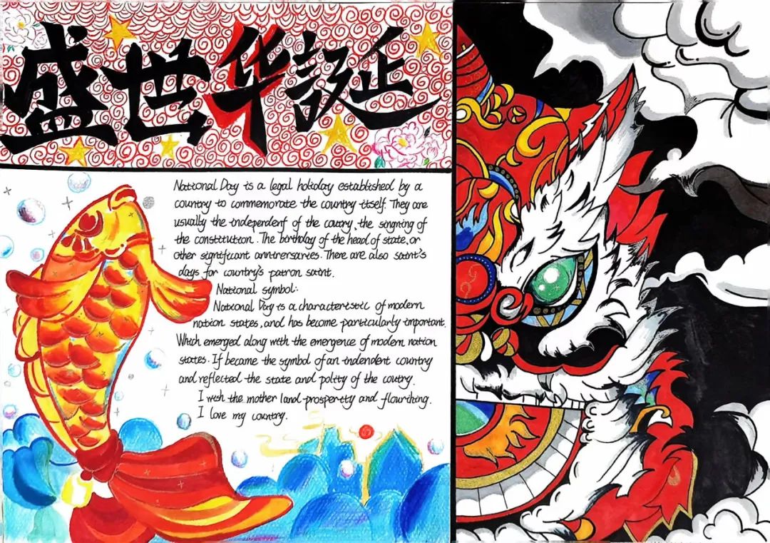 | / ★ 繁星闪烁庆国泰,万里长城月明中,青春之力映华夏,庆典烟花耀苍穹。为热烈庆祝中华人民共和国成立75周年,加强和促进学生的思想道德建设工作,厚植学生爱党爱国情怀,引导学生扣好人生的第一粒扣子,传承红色基因,2024年10月,南星中学五里桥校区初二英语备课组举行了“礼赞祖国 欢度国庆”英文手抄报比赛活动。 在本次活动中,同学们用笔墨展现了新时代中学生的爱国主义情怀,同时也提升了同学们的英语阅读、写作能力和书写水平。愿同学们不忘初心,继续传承红色基因,坚定理想信念,努力成长为堪当民族复兴大任的时代新人。 秉持公正、公平、公开原则,经过激烈讨论,八年级英语备课组评选出特、一、二、三等奖以及优秀奖作品。 “礼赞祖国 欢度国庆”英文手抄报获奖名单如下: 活动一经开展,便受到同学们的全力支持。他们查询有关国庆的由来、习俗、古诗文,用英文词句和精美的图画描绘他们心中繁荣昌盛的祖国。红色蔓延,是我们熊熊燃烧的爱国魂;黄色耀眼,是我们朝气蓬勃的生命力。活动达到了寓教于乐,提升学生英语学习能力的目的。现在,让我们一起走进孩子们的英语世界吧! 特等奖展区 一等奖作品集锦 本次英语学科活动为学生提供了展示的平台,让他们收获了用英文创作的快乐,从而增强了他们学习英语的自信心,更增强了其文化自信,展现了他们的艺术才华,让同学们在创作的过程中培养爱国之情,砥砺强国之志,凝聚奋进力量。 图文来源:五里桥校区初二英语备课组 编辑、初审:袁佳佳 复审:林夏蓉 终审:郑振隆