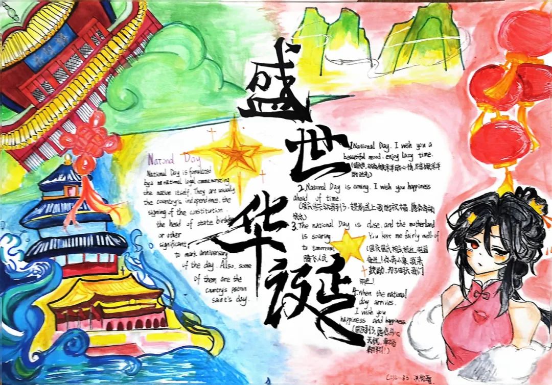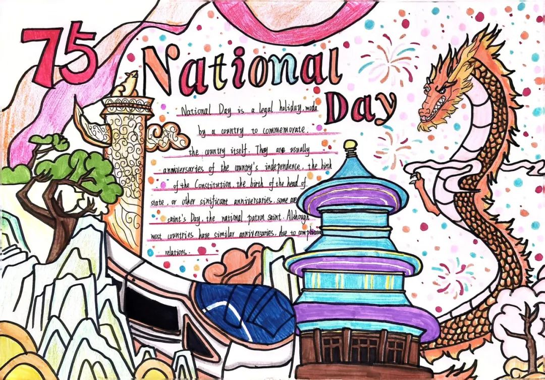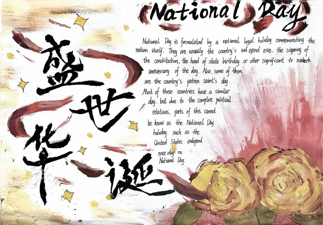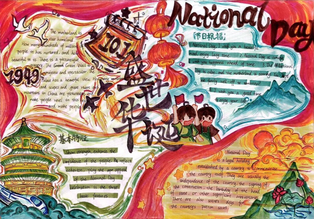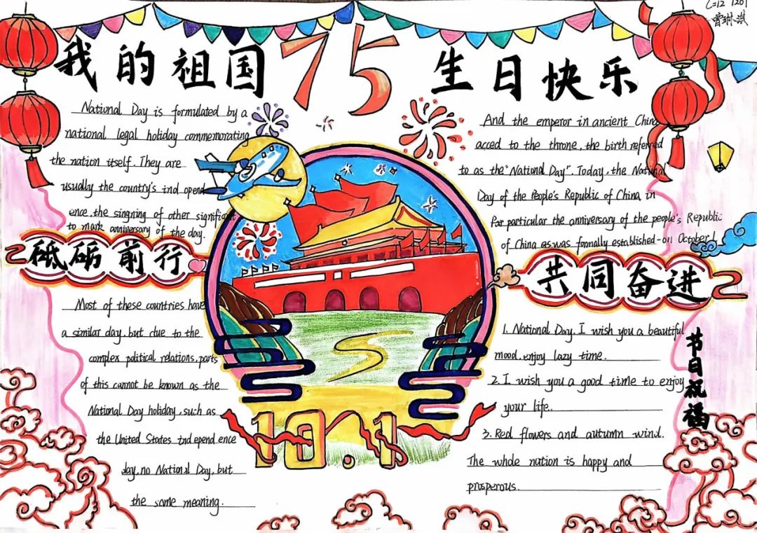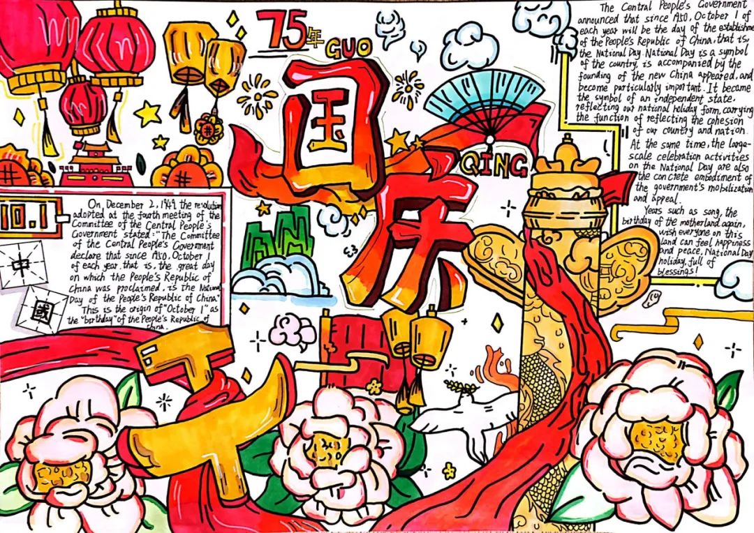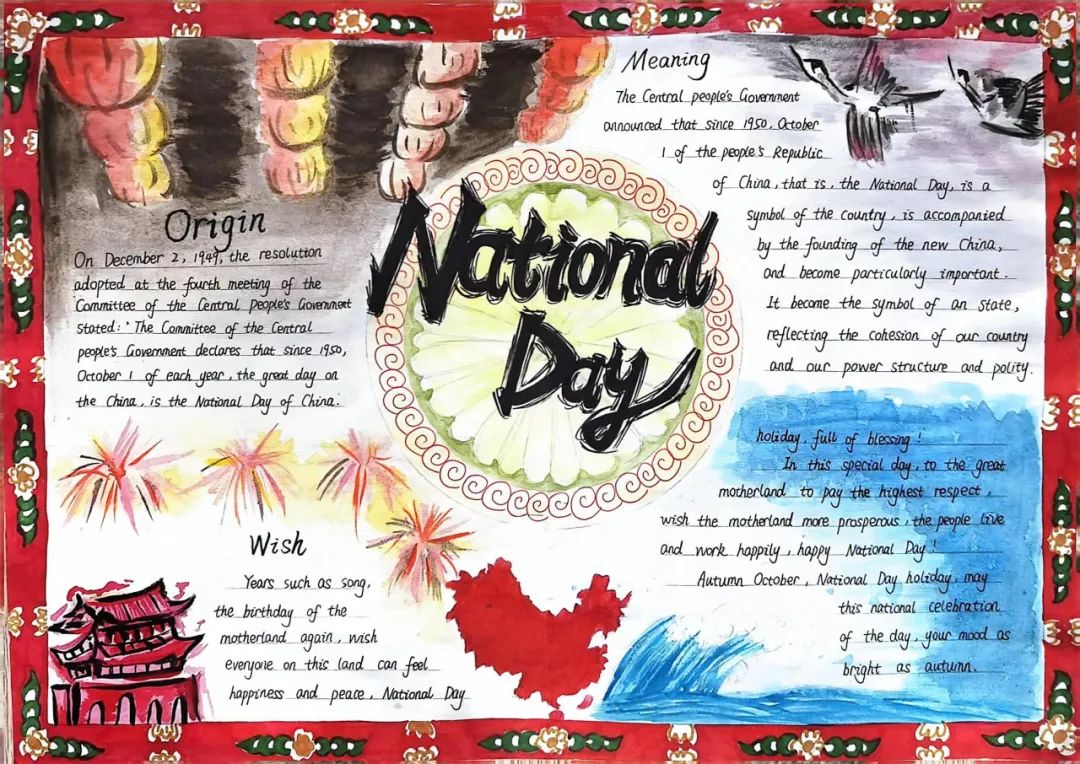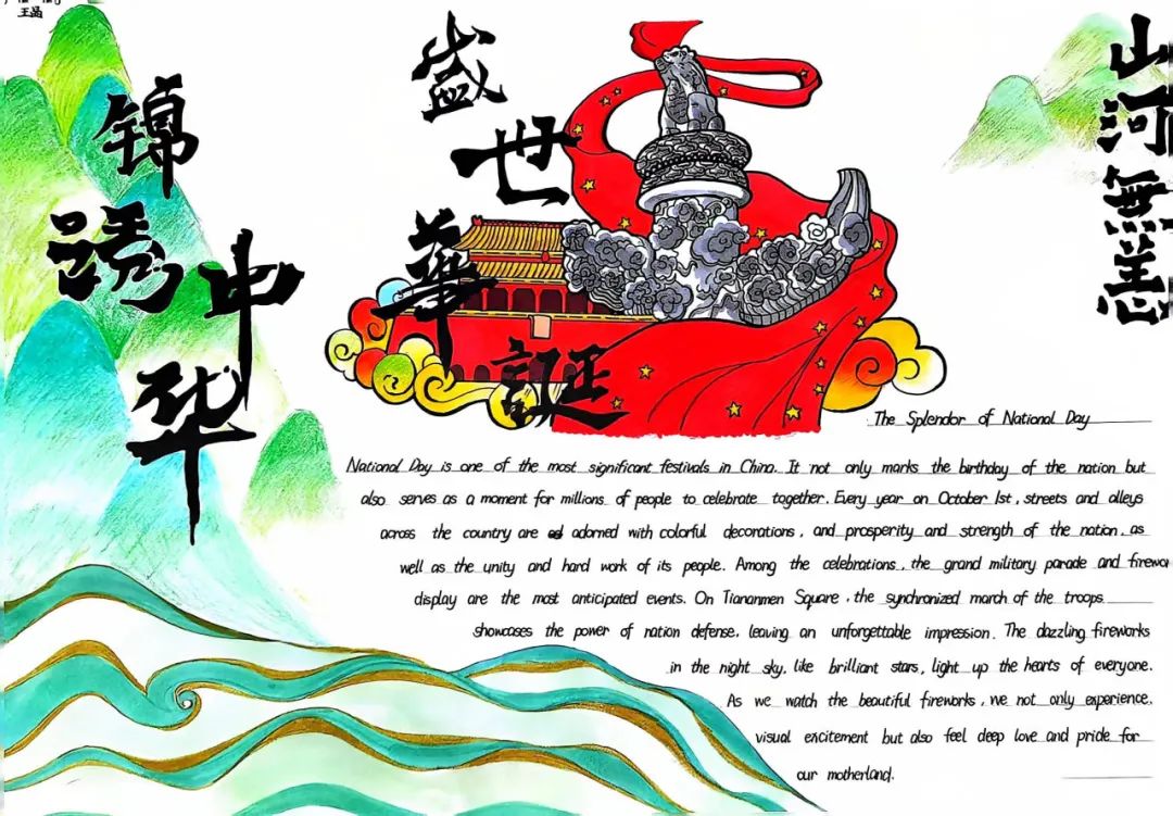 | / ★ 繁星闪烁庆国泰,万里长城月明中,青春之力映华夏,庆典烟花耀苍穹。为热烈庆祝中华人民共和国成立75周年,加强和促进学生的思想道德建设工作,厚植学生爱党爱国情怀,引导学生扣好人生的第一粒扣子,传承红色基因,2024年10月,南星中学五里桥校区初二英语备课组举行了“礼赞祖国 欢度国庆”英文手抄报比赛活动。 在本次活动中,同学们用笔墨展现了新时代中学生的爱国主义情怀,同时也提升了同学们的英语阅读、写作能力和书写水平。愿同学们不忘初心,继续传承红色基因,坚定理想信念,努力成长为堪当民族复兴大任的时代新人。 秉持公正、公平、公开原则,经过激烈讨论,八年级英语备课组评选出特、一、二、三等奖以及优秀奖作品。 “礼赞祖国 欢度国庆”英文手抄报获奖名单如下: 活动一经开展,便受到同学们的全力支持。他们查询有关国庆的由来、习俗、古诗文,用英文词句和精美的图画描绘他们心中繁荣昌盛的祖国。红色蔓延,是我们熊熊燃烧的爱国魂;黄色耀眼,是我们朝气蓬勃的生命力。活动达到了寓教于乐,提升学生英语学习能力的目的。现在,让我们一起走进孩子们的英语世界吧! 特等奖展区 一等奖作品集锦 本次英语学科活动为学生提供了展示的平台,让他们收获了用英文创作的快乐,从而增强了他们学习英语的自信心,更增强了其文化自信,展现了他们的艺术才华,让同学们在创作的过程中培养爱国之情,砥砺强国之志,凝聚奋进力量。 图文来源:五里桥校区初二英语备课组 编辑、初审:袁佳佳 复审:林夏蓉 终审:郑振隆