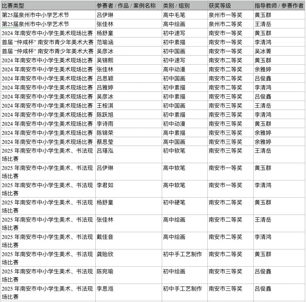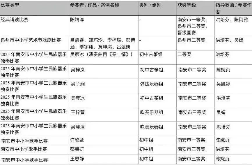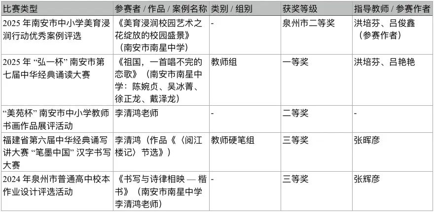 在南星中学的校园里,艺术组的老师们始终秉持着 “以研促教,以美育人” 的理念,深耕教学教研,助力学生在艺术之路上绽放光彩。2025春季学期,一系列教研活动与美育成果的涌现,生动展现了艺术组的育人活力 。 艺术组的老师们定期开展教研活动,在交流探讨中碰撞思维火花。课堂上,大家分享教学经验、打磨授课技巧;课外,聚焦美育前沿理念,思考如何将艺术素养培育融入日常教学。一次次研讨,为美育教学注入新活力,让艺术课堂更具感染力与启发性,引领学生感知艺术魅力,挖掘创作潜力 。 (一)学生赛场展风采 在各类艺术赛事中,南星学子凭借扎实的艺术功底与独特创意,收获累累硕果: • 经典诵读:陈靖淳同学在经典诵读比赛中,斩获南安市一等奖、泉州市二等奖晋级国赛 ,以声传情,诠释经典魅力。 • 戏剧、歌手比赛:在泉州市中小学艺术节戏剧比赛中,吕凯睿、郑巧泠等多位同学组成的团队,以精彩的表演赢得泉州市二等奖;南安市中小学歌手比赛中,许欣蓝、蔡馨妍、王恩静等同学,分别获得南安市一等奖、三等奖,用精彩表演传递艺术情感。 • 器乐独奏:民族器乐独奏比赛中,我校学生更是大放异彩。吴彦冰、吴梓岚、吴子娴、王梓萱、吴津津等同学,分别在初中古筝组、弹拨乐器组、吹奏乐器组等不同组别中,斩获南安市二等奖、三等奖等多个奖项,用灵动旋律展现艺术造诣。 • 美术书法:美术类比赛同样成绩斐然,从南安市中小学生美术现场比赛,到首届“仲咸杯”南安市青少年美术大赛 ,李诗雨、吕思颖等众多同学在动漫、国画、素描、速写等类别中摘金夺银,以笔绘心,勾勒艺术天地。 (二)教师教研结硕果 老师们在教学教研与专业竞赛中同样表现亮眼: • 李清鸿老师参加“美苑杯”南安市中小学教师书画作品展评活动获二等奖 ,福建省第六届中华经典诵写讲大赛“笔墨中国”汉字书写大赛中,作品《<阅江楼记>节选》获三等奖,在2024年泉州市普通高中校本作业设计评选中,作品《书写与诗律相映 —— 楷书》获三等奖。 • 艺术组案例、作品也在各类评选中出彩,如洪培芬、吕俊鑫老师的《美育浸润校园艺术之花绽放的校园盛景》获中小学美育浸润行动优秀案例评选泉州市二等奖 ;在南安市第七届中华经典诵读大赛中,洪培芬、陈婉贞老师参与指导、比赛的《祖国,一首唱不完的恋歌》获南安市一等奖,展现团队教研实力。 艺术组将美育融入日常,从课堂教学到赛事实践,从作品创作到艺术展演,为学生搭建多元成长平台。在这里,学生们不仅提升艺术技能,更在艺术滋养中培养审美情趣、人文素养,让艺术成为成长路上的一抹亮色,助力他们成为有情怀、有创意的青春追光者 。 未来,南星中学艺术组将继续深耕教研、践行美育,让艺术之花在校园更加绚烂绽放,陪伴更多学子以美为翼,翱翔于艺术与成长的广阔天空 ! END 策划:艺术组 初审:陈晴梅 复审:林夏蓉 终审:郑振隆