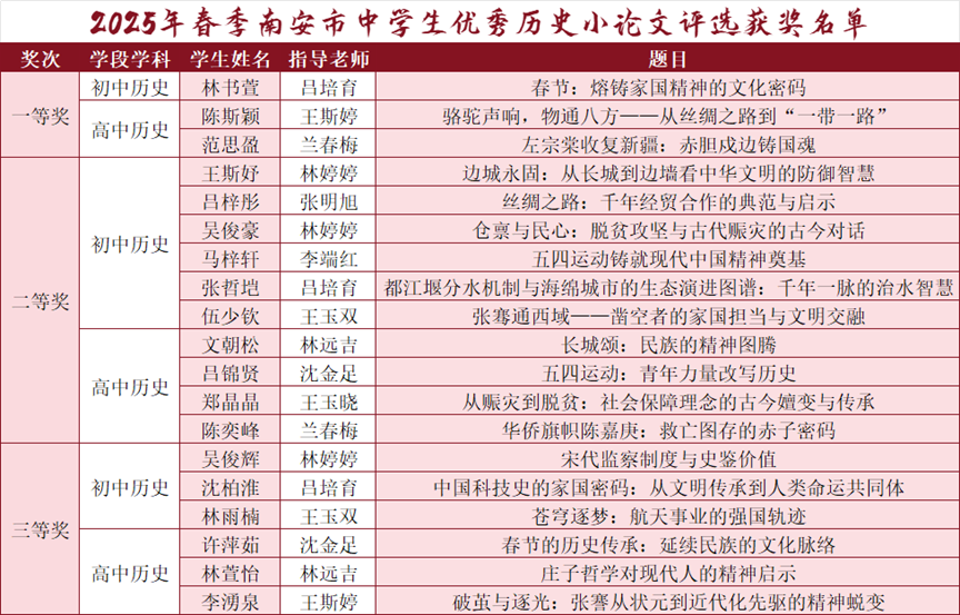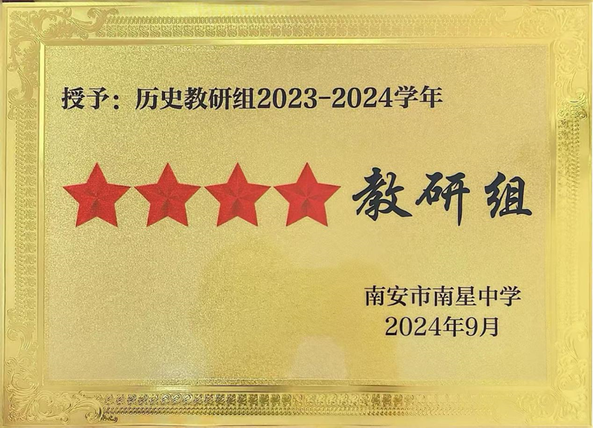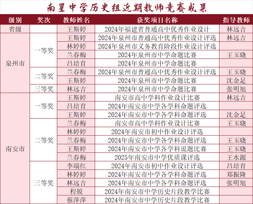 “以史为鉴可以知兴替”,历史课程在培育学生社会主义核心价值观方面起着至关重要的作用。在立德树人根本目标的引领下,南星中学历史组在教研和教学活动过程中始终贯彻“史海共研,教学相长”的理念,以研促教,以教促学,以期推动教师与学生的共同发展。 一、教而有方,研教赋能 历史组教师以集体备课为基石、以跨年级研讨为桥梁,创新情境教学、项目式学习等模式,激发学生探究欲,将厚重的历史知识转化为生动课堂。通过常态化的听评课与课题研究,教师团队不断打磨课堂,让学生在追溯文明脉络中涵养家国情怀,在思辨交锋中提升核心素养。 二、溯史探微,硕果盈枝 学 生 获 奖 教研筑基,学子摘星。2025年春,南安市教师进修学校进行了南安市中学生优秀历史小论文评选。我校学生作品总计获奖19人次,其中一等奖3人,二等奖10人,三等奖6人。学生在比赛中的优异成绩正是历史组高效教研反哺教学、助力学生成长的有力印证。 教 师 成 果 教学相长,共促未来。在学生取得丰硕成果的同时,教师也在不断精进自身的业务能力,以期实现教学相长的良性循环。2024年度,我校被确定为泉州市基础教育“十四五”第二批学科教学研究基地校(初中历史)。 2024-2025年度,历史组教师在课题研究方面继续深入探索,由沈金足老师主持的南安市级课题《激励式导向下学生综合素质评价的实践研究》(立项批准号:NG1452-048)顺利结题,由吕培育老师主持的泉州市课题《核心素养导向下的初中历史跨学科作业设计与评价的实践研究》(立项批准号:QJYKT2024-089)、王斯婷老师主持的南安市课题《大单元视域下统编高中历史教材融通的实践研究》(立项批准号:NG1455-034)顺利开题。 此外,历史组教师还积极参与各级各类教学竞赛,并获得丰硕成果,在2024-2025年度总计获奖21项,其中省级1项,泉州市级7项,南安市级一等奖及以上获奖占比过半,充分展现了优秀教研组的风范。 结语 长久以来,南星中学历史组始终秉持历史人的初心,深耕教学一线,以扎实的教研夯实根基,用创新的课堂点亮思维,引导学生在浩瀚史海中感悟文明兴衰,涵养家国情怀。历史组将继续锚定学科育人目标,深化教研活动,探索数字化教学新路径,在历史教学的“广阔天地”中不断探索,期待今后“大有作为”! 策划:历史组 撰稿:历史组 编辑:陈亚勤 初审:王玉晓 复审:林夏蓉 终审:郑振隆