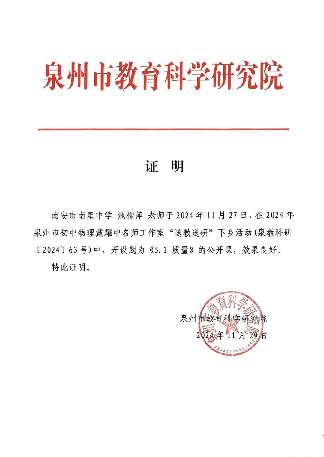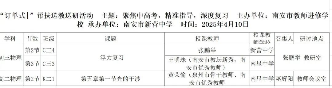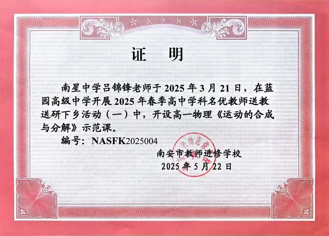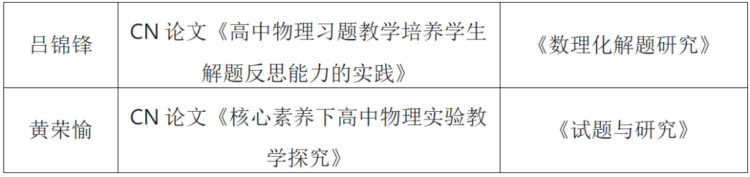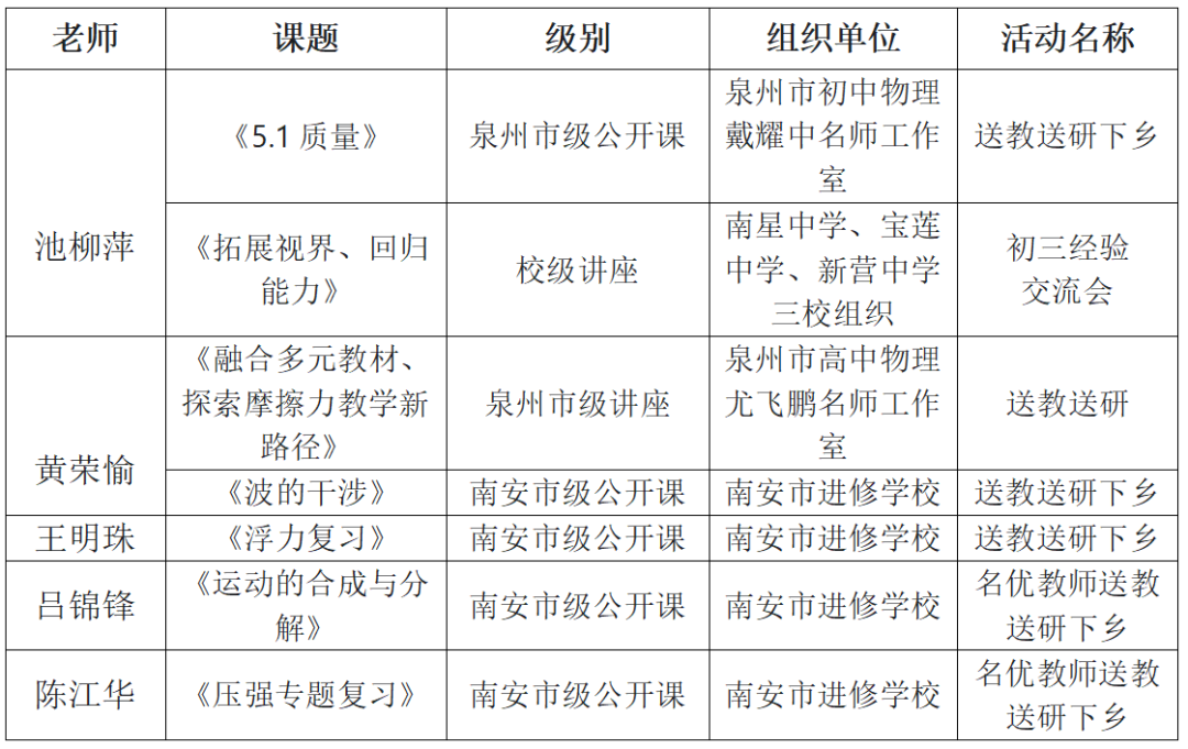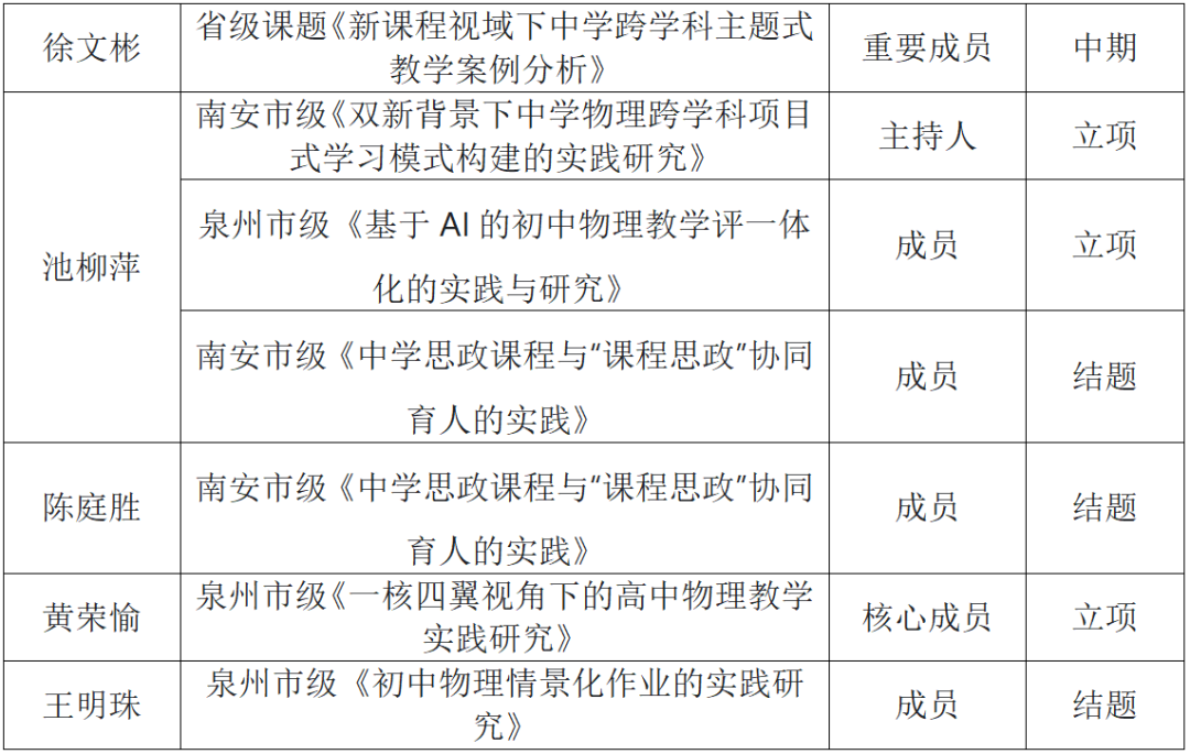 2024-2025学年,物理组老师凭借卓越的教学能力和突出的贡献,收获了多项荣誉称号。 我校物理教师积极走出校园,通过公开课和专题讲座传播先进教学方法,如同物理中的“能量传递”,将优质教学资源辐射到更广阔的领域。此外,学校借力名师工作室与专家资源,特邀尤飞鹏名师工作室于 4 月16日-17日到校指导,持续推动教研组工作提质增效。 如同物理实验中对规律的不懈探究,物理组教师在教学研究领域持续深耕,多项课题与论文成果凸显专业深度: 课题研究: 论文发表: 在教师技能比赛中,我校物理教师如同“运动的物体”,凭借精准的教学把控力斩获佳绩: 池柳萍老师的《牛顿第一定律》获南安市中学优质课初中物理学科三等奖;其在2024年泉州市中学命题比赛中获二等奖(指导老师:刘丁忠),彰显了命题与授课的双重实力。吴伟滨、黄茹婷老师在2024年秋南安市物理说题比赛中获南安二等奖,李明桥老师获南安市三等奖,展现了对物理题目的深刻解析能力。 我校物理教师化身“引路人”,指导学生在各类比赛中突破自我,如同“力的作用”,推动学生成长。 “探索身边的科学”微视频比赛: 策划:物理组 图文:物理组 编辑:陈亚勤 初审:黄荣愉 复审:林夏蓉 终审:郑振隆