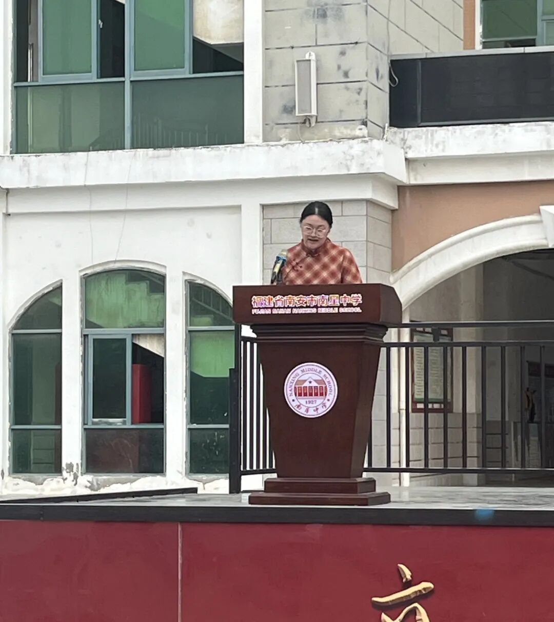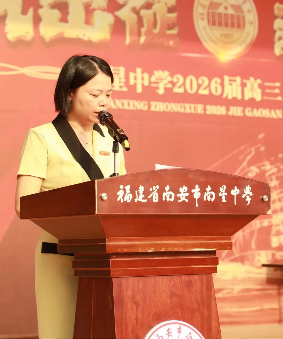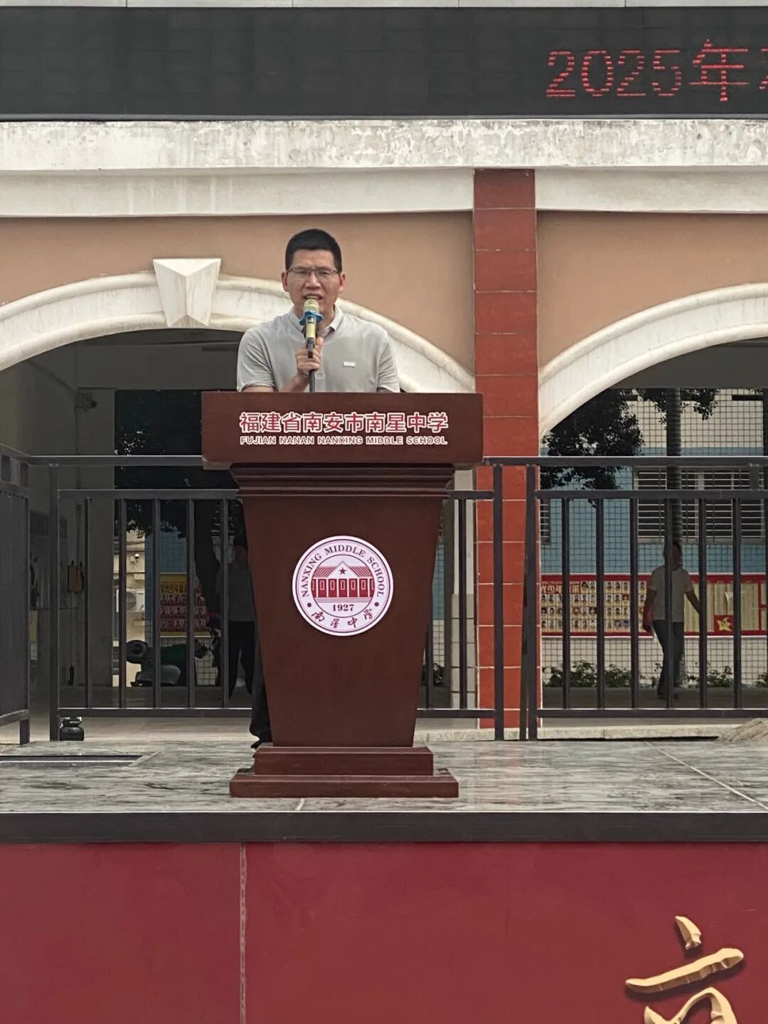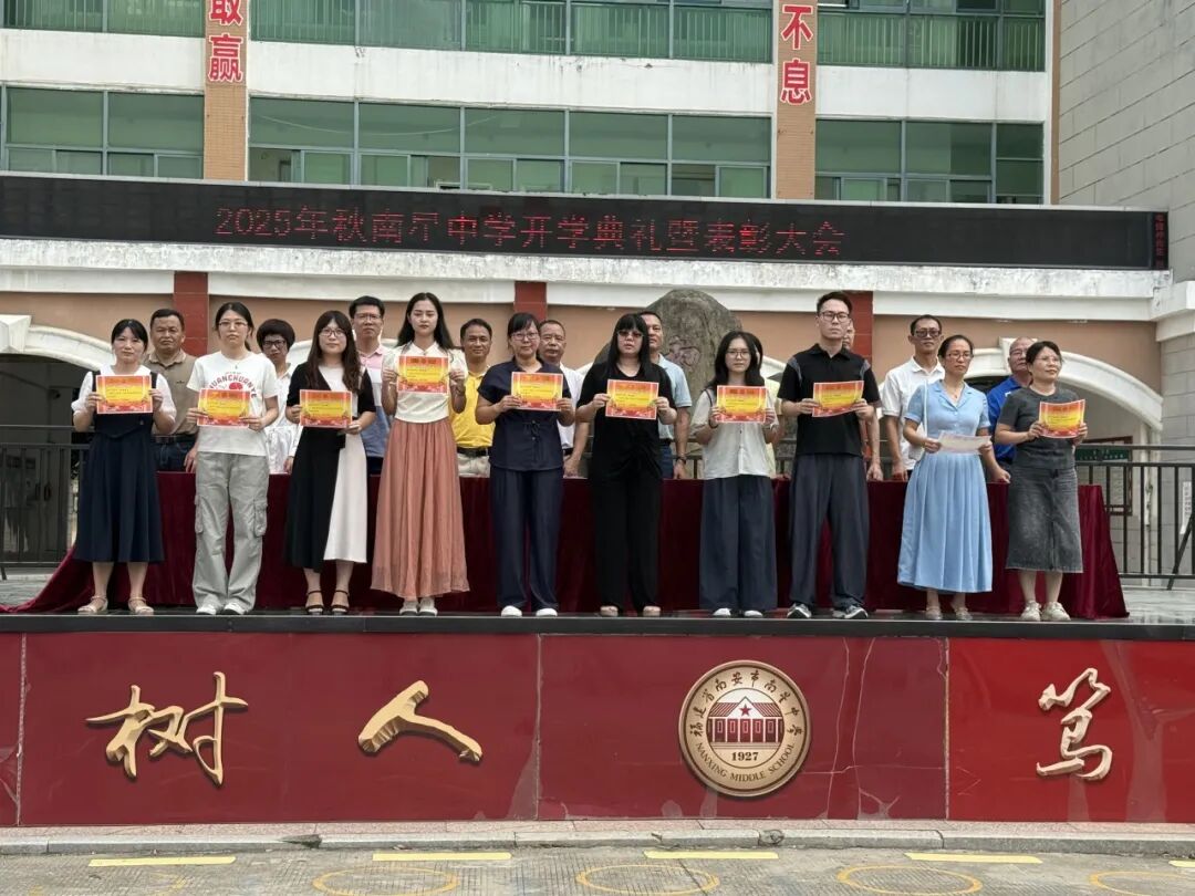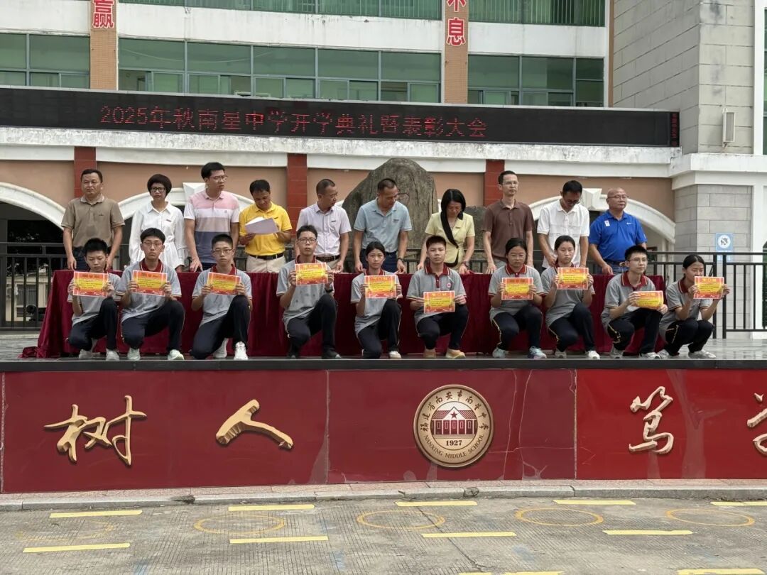 江鸿霖副宣读2025届中考成绩位居南安市前1000名并签约录取于我校的学生的表彰决定,激励新初三学子以此为榜样,奋进拼搏。